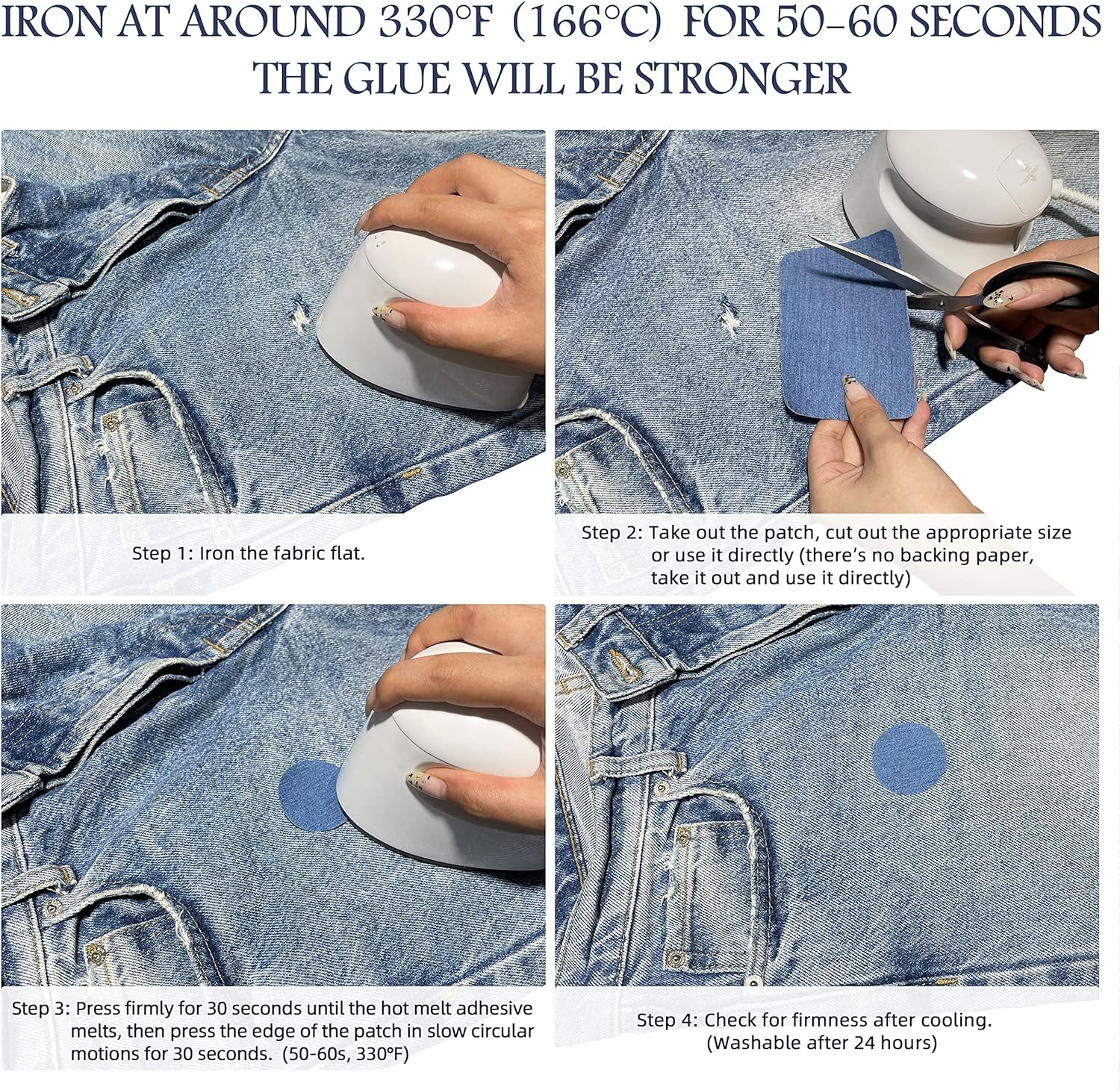 - Easier to Use: Our denim iron-on repair patches can repair or decorate your clothes in minutes, easy to apply in clothing repair, reinforcement, decoration. Open the package, remove the denim patch, stick it on the proper spot and iron at 330°F for one minute. (Can be used both inside and outside, no backing, no instructions for use)